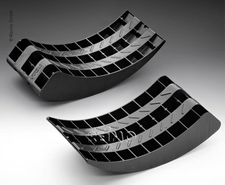 Inovatívny okrúhly klin. Farba: čierna. Testované maximálne zaťaženie: 1 250 kg na koleso. Plynulé vyrovnávanie výšky a parkovanie šetrné k pneumatikám! Tvar okrúhleho klinu je prispôsobený krivke pneumatiky vozidla. Umožňuje homogénny nájazd, bezpečné parkovanie, jednoduchý plynulý nájazd (do max. 10 cm) a optimálnu ochranu pneumatík. Zaťaženie sa vždy rozkladá zhora, takže okrúhly klin nemôže skĺznuť. Nie je potrebná žiadna pomoc pri kolízii! Dodáva vozidlu stabilitu. Schválené do priemeru pneumatiky približne 70 cm.