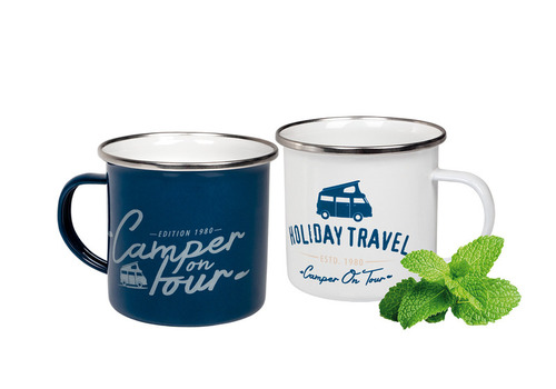 2 smaltované hrnčeky zo série HOLIDAY TRAVEL v modrej farbe s potlačou CAMPER ON TOUR a bielej farbe s potlačou HOLIDAY TRAVEL (každý s obojstrannou potlačou).