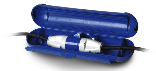 Modrý kábel bezpečný pre pripojenie CEE proti vlhkosti s gumovým tesnením a zámkom.