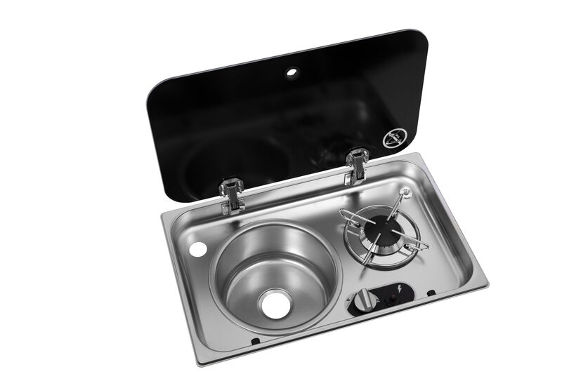 Varná doska z nehrdzavejúcej ocele s čiernym skleneným krytom - 1 horák SR a drez na ľavej strane.