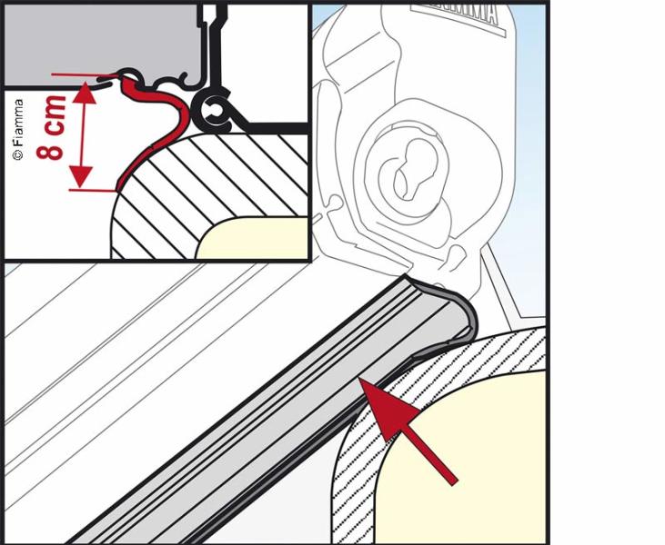 Spodná ochrana proti dažďu pre markízy F45S so vzdialenosťou medzi kazetou a vozidlom so zvýšenou montážou. Dĺžka 550 cm