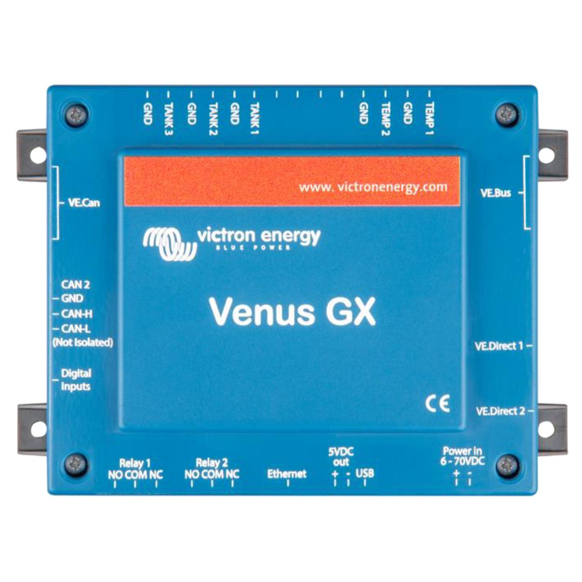Venus Vám umožňuje česky mluvit se všemi součástmi Vašeho systému a zajistí aby, dokonale pracovali. Sledujte živá data, provádějte změny nastavení, aktualizujte pomocí smartphonu, nebo PC přes volně přístupný portál VRM. Venus GX poskytuje intuitivní ovládání a monitorování a možnost vzdáleného nastavování systému Victron Energy, které jsme pro Vás nově připravili i v českém jazyce. Má stejnou funkčnost jako podobná jednotka Color Control GX s několika výhodami: - nižší cena hlavně proto, že nemá LCD displej ani tlačítka- 3 vstupy čidla nádrže- 2 teplotní vstupy Prohlédněte si podrobný online manuál s popisem všech funkcí zde. Představení jednotky Venus GX Aktualizace firmwaru je možno provádět automaticky, pokud bude zařízení napojeno na internet (přes UTP kabel, nebo pomocí vestavěné WiFi). Podporované produkty:- Jednotky MultiPlus a Quattro, includjednofázové i třífázové systémy. Monitorování a kontrola(zapnutí / vypnutí a omezovač proudu). Změna konfigurace je možná (pouze vzdáleně přes internet, ne bez připojení k internetu).- BlueSolar MPPT Solarní regulátory s VE.Direct portem.- BlueSolar MPPT 150/70 a MPPT 150/85 s VE.Can portem.- BMV-700 produkty se zapojí přímo do VE.Direct portu na Venus GX – pro toto použijte VE.Direct kabel.- Nabíječky baterií Skylla-i- NMEA2000 čidla nádrží- USB GPS může být připojen do USB portu. TheData jsou posílána do VRM Portálu pro účely sledování. Mapa na VRM zobrazí poslední pozici.- Síťové invertory FroniusPokud je třeba připojit více než dva produkty VE.Direct, lze použít USB.Jak připojit jednotku Venus GX VRM Online PortalKromě sledování a kontroly produktů Victron, předává Color Control GX také informace naší bezplatné monitorovací internetové stránce: VRM online portálu. Chcete-li získat představu o funkcích on-line portálu VRM, navštivte https://vrm.victronenergy.com/, a pomocí tlačítka "Try demo tour" si prohlédněte možnosti monitoringu. Portál a kompletní monitoring je zcela zdarma. Zaznamenávání datPo připojení k internetu jsou všechna data odeslána na portál VRM. Pokud není k dispozici připojení k internetu, data Venus GX ukládají data interně do 48 hodin. Vložením karty microSD nebo USB paměti můžete uložit více dat. Tyto soubory lze poté nahrát na portál VRM nebo provést konverzi offline pomocí aplikace VictronConnect pro analýzu. Automatické spuštění / zastavení GenerátoruVysoce přizpůsobitelný systém start / stop. Používejte stav nabití, napětí, zatížení a další parametry. Definujte speciální sadu pravidel pro klidné časy a volitelně měsíční zkušební provoz. Srovnání Color Control GX a Venus GX User interface CCGX Venus GX LCD Display and 7 buttons yes no Remote Console yes yes Victron comm. ports CCGX Venus GX VE.Direct 2 dedicated ports - isolated 1) VE.Can 2 paralleled RJ45 sockets – isolated VE.Bus 2 paralleled RJ45 sockets – isolated Non Victron-products CCGX Venus GX Canbus-BMS batteries Many battery brands. See here for details Fronius PV Inverters See here for details Communication CCGX Venus GX USB 2 USB Host ports – not isolated Ethernet 10/100 RJ45 socket - isolated except shield WiFi optional 2) builtin, but see 3) Bluetooth Smart no future function 4) Micro SDcard slot SDHC cards up to max. of 32GB. 5) Second CAN-bus port no future function 6) IO CCGX Venus GX Programmable relay 7) 1x NO 1x NO / NC 8) Resistive tank level inputs no 3 9) Temperature measurements no 2 10) Digital IO no future function 11) Other CCGX Venus GX Outer dimensions ( h x w x d ) 130 x 120 x 28 mm 45 x 143 x 96 mm Operating temperature -20 to +50°C Standards CCGX Venus GX Safety EN 60950 .
